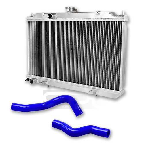 DPT, RA-NSPECV00-2+RH-NSPECV00-BL, Full Aluminum Performance Two Dual Row Core Chrome Radiator with Bolt On 3 Ply 4mm Blue Silicone Radiator Hoses Overall Size 28"x20"x3.5" for Manual Transmission Only?This Aluminum Radiator is designed to provide maximum cooling efficiency to prevent premature engine failure. Its light-weight, and high-heat transferring aluminum features a tube and fin design that, dramatically increases surface area that enables the heat to dissipate more efficiently. This Aluminum Radiator is at least 40% more efficient than stock ones. Most importantly, it has a much higher capacity for coolant than stock ones, which means that your cooling system will be more efficient and will be more resistant to temperature surges in racing applications.